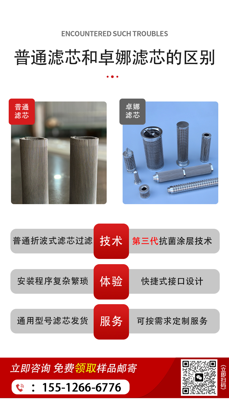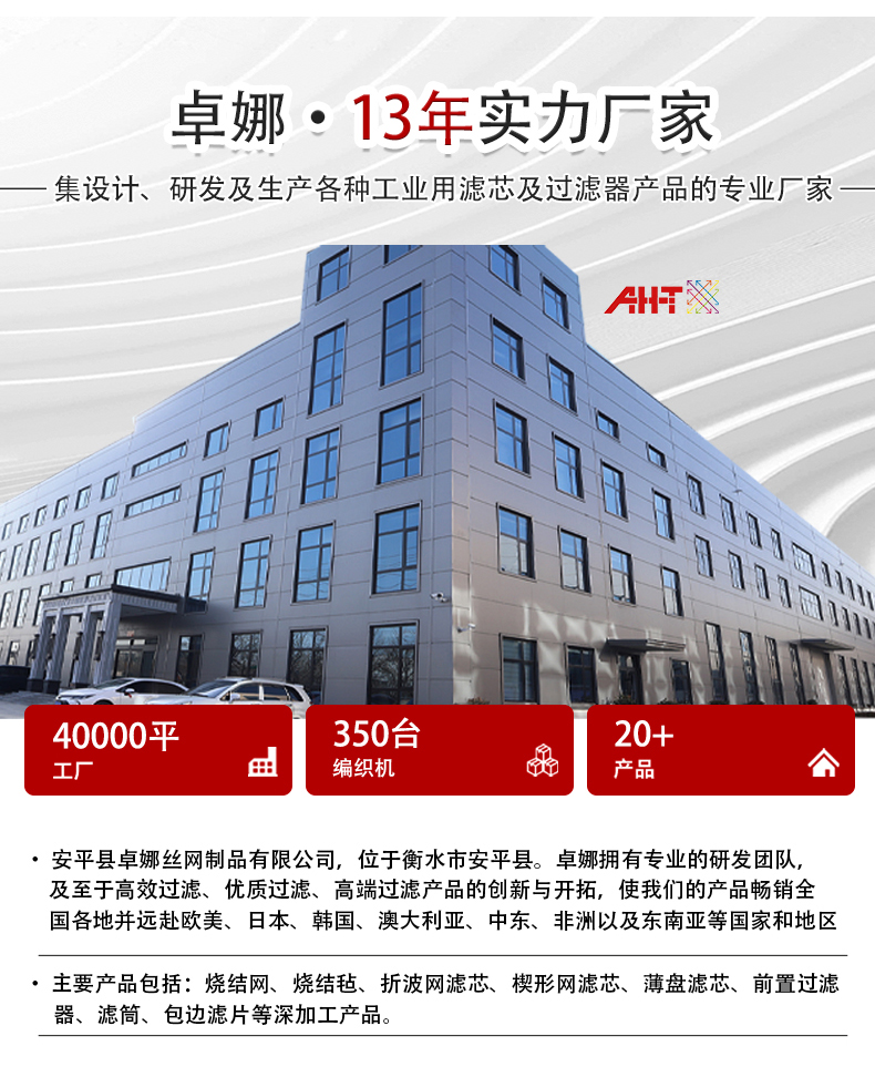 安平县卓娜丝网制品有限公司是一家集设计、研发及生产各种工业用滤芯及过滤器产品的专业厂家。主要产品包括烧结网、烧结毡、折波网滤芯、烧结网滤芯、楔形网滤芯、薄盘滤芯、前置过滤器滤芯,滤筒、包边滤片等深加工产品。