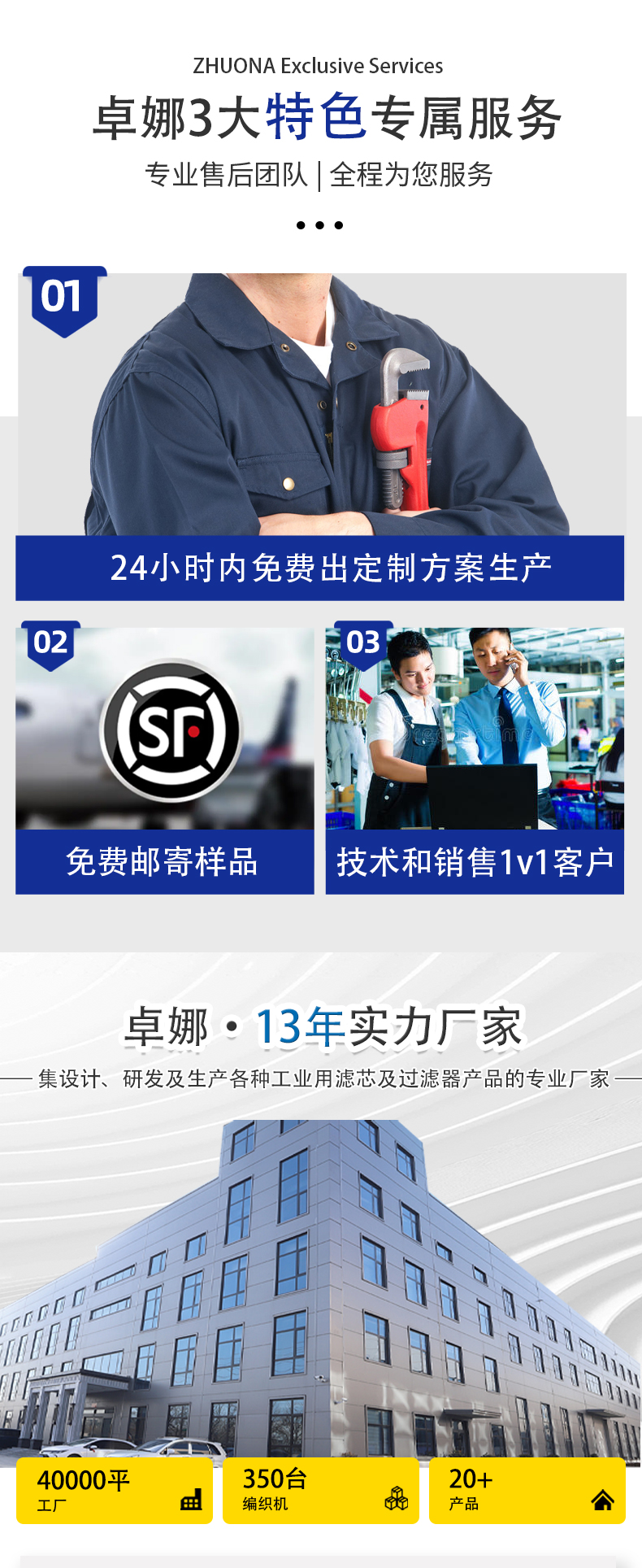 安平县卓娜丝网制品有限公司是一家集设计、研发及生产各种工业用滤芯及过滤器产品的专业厂家。主要产品包括烧结网、烧结毡、折波网滤芯、烧结网滤芯、楔形网滤芯、薄盘滤芯、前置过滤器滤芯,滤筒、包边滤片等深加工产品。