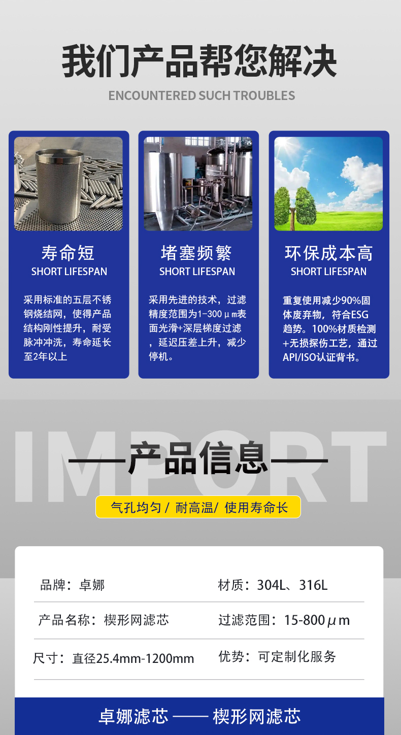 安平县卓娜丝网制品有限公司是一家集设计、研发及生产各种工业用滤芯及过滤器产品的专业厂家。主要产品包括烧结网、烧结毡、折波网滤芯、烧结网滤芯、楔形网滤芯、薄盘滤芯、前置过滤器滤芯,滤筒、包边滤片等深加工产品。